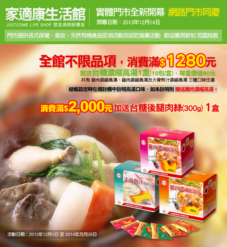 全館不限品項,消費滿1280元,就送台糖濃縮高湯1盒(10包/盒),每盒價值80元。